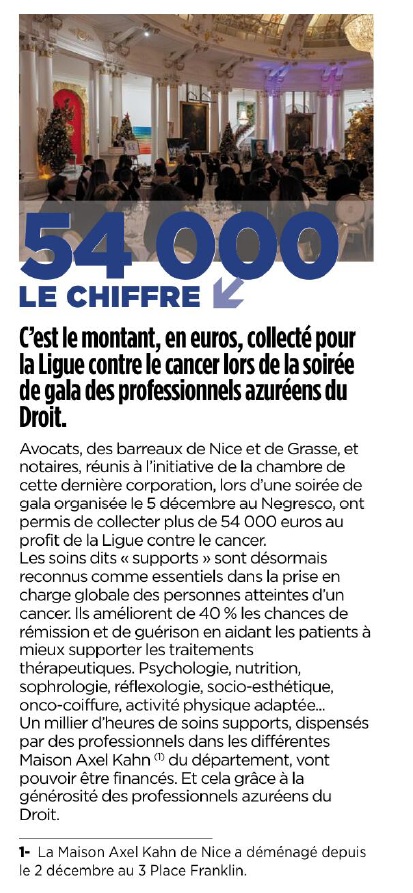 Grâce à l’engagement des notaires, avocats, partenaires et artistes, 54 000 € ont été collectés lors du Gala caritatif organisé le 5 décembre dernier à l’Hôtel Le Negresco par la Chambre des Notaires 06 aux côtés du Barreau de Nice et de l’Ordre des avocats du Barreau de Grasse.
