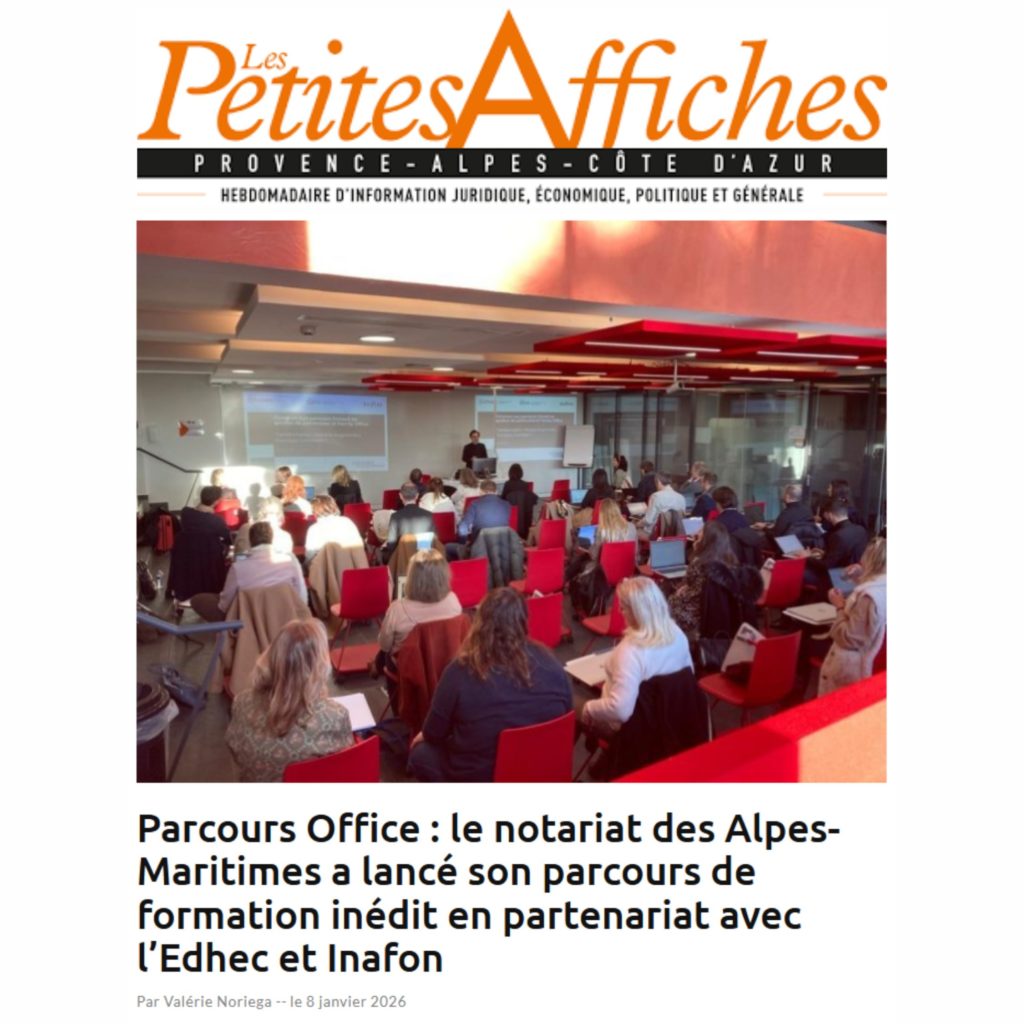 Les Parcours Office ont démarré ce jeudi 8 janvier, Les Petites Affiches des Alpes-Maritimes reviennent sur la dynamique portée par la Chambre des Notaires 06, en partenariat avec l’EDHEC Business School Augmented Law Institute et l’INAFON – Institut Notarial de Formation.
